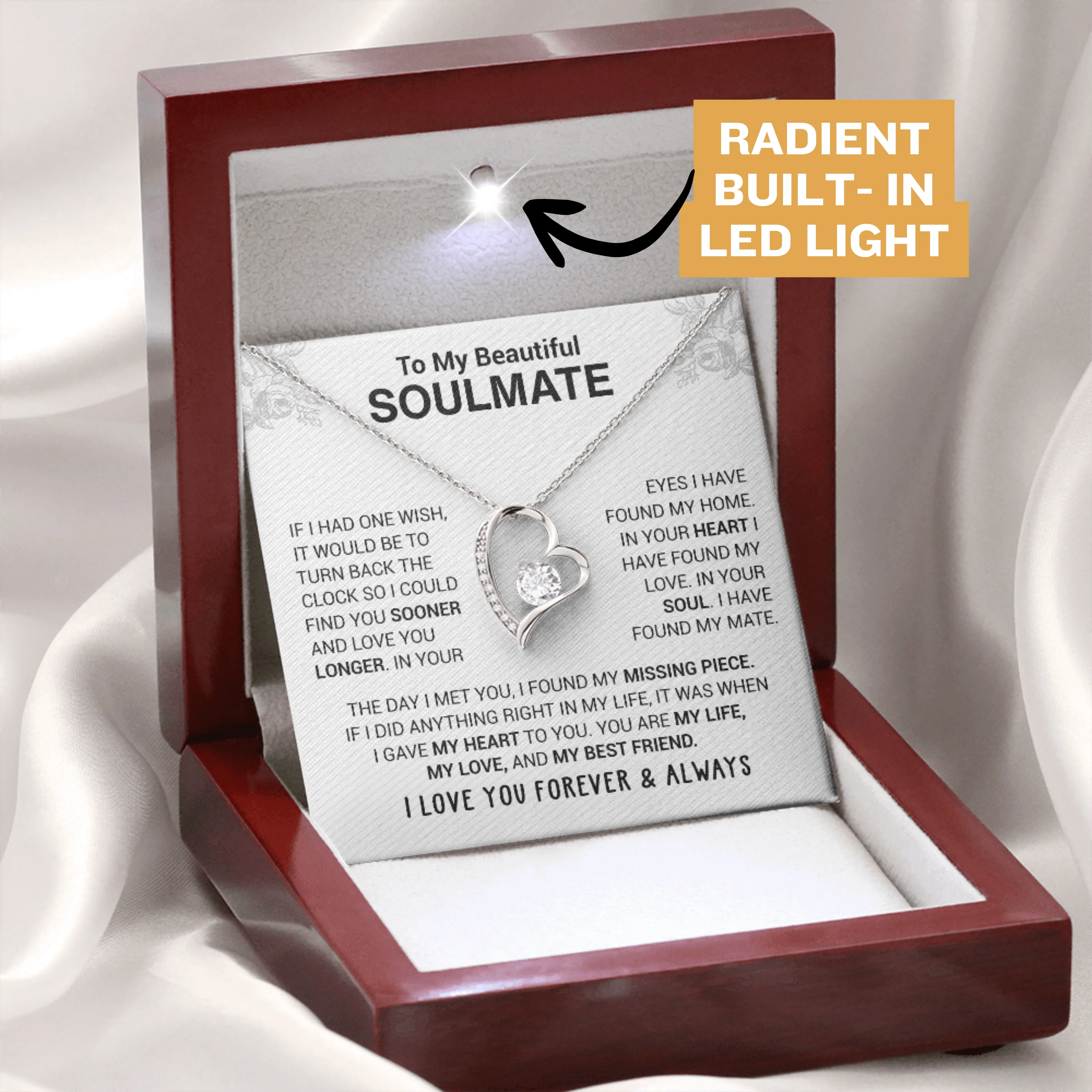 The Message Says: “To My Beautiful Soulmate – If I had one wish, it would be to turn back the clock so I could find you sooner and love you longer. In your eyes, I have found my love. In your soul, I have found my mate. The day I met you, I found my missing piece. If I did anything right in my life, it was when I gave my heart to you. You are my life, my love, and my best friend. I love you forever and always.”